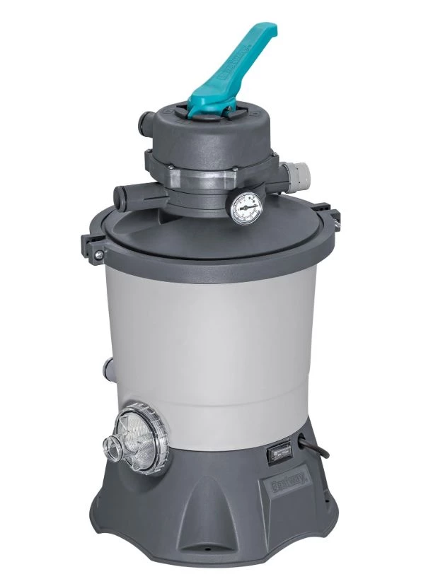 Песочный фильтр-насос подключается к бассейну двумя гофрированными шлангами, и обеспечивает циркуляцию и очистку от внешних загрязнителей.