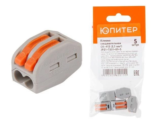 Клемма ЮПИТЕР СК-412 2,5 мм2 5 штук (JPZ1-7201-01-5) используется для присоединения и ответвления до 2 одножильных проводников сечением от 0,1 мм² до 2,5 мм² в электрических цепях переменного тока с частотой 50Гц напряжением до 380В. Соединительная клемма обеспечивает быстрый монтаж и демонтаж проводников без дополнительных инструментов, а также создает надежное соединение медных многожильных и одножильных проводников от 0,1 до 2,5 мм2.