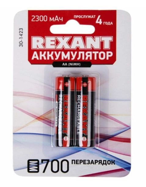 Аккумулятор АА REXANT 1,2 V 2300 mAh никелевый 2 штуки (30-1423) подходят для использования в устройствах высокого энергопотребления (фотоаппаратах, плеерах, радиоприёмниках, фонарях, детских игрушках и т.п.).