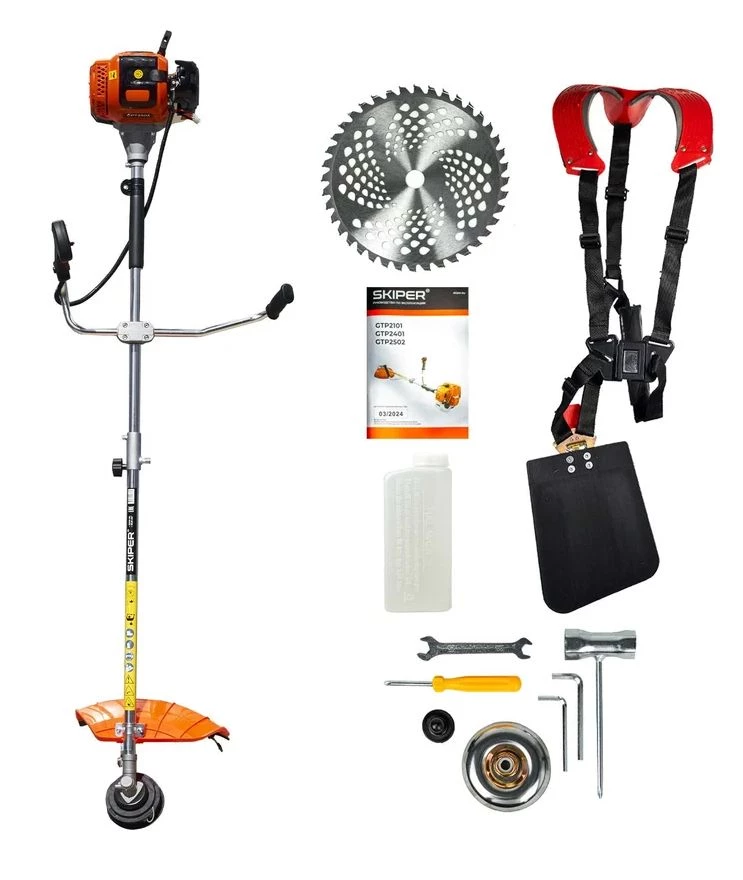 Мощность, Вт:2500Вид двигателя:бензиновыйМасса нетто, кг:10Комплектация:руководство по эксплуатации, триммерная головка, ранцевый ремень, защитный кожух, металлический диск, емкость для топливной смеси, набор инструментов, набор крепежный.Гарантия:1 годОбъем топливного бака, л:1,2Мощность двигателя, л.с.:3,4Объем двигателя, см3:52Ширина кошения ножом, мм:250Ширина скашивания леской, мм:430Диаметр лески, мм:2,4Стартер:easy starterНож в комплекте:даДиаметр ножа, мм:250Макс. обороты двигателя, об/мин:9000