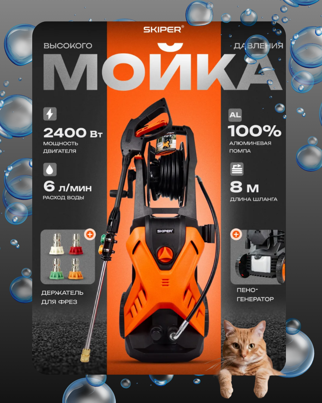 Мощность, Вт:2400Производительность, л/мин:60Длина сетевого шнура, м:5Масса нетто, кг:10,2Комплектация:Корпус мойки высокого давления, Ручка для перемещения, Держатель моечного пистолета, Колёса, Моечный пистолет, Насадка-удлинитель для пистолета, Шланг высокого давления для воды, Комплект моечных фрез, Быстросъёмные коннекторы для шлангаГарантия:12 месМакс. допустимое давление, Бар:180Макс. рабочее давление, Бар:120Материал корпуса насоса:алюминийМакс. температура вода на входе, град.С:40Длина шланга, м:8Насадки:Красная (0) - точечное распыление, самая мощная струя; Жёлтая (15) - узкая струя, наиболее используемый тип; Зелёная (25) - широкая струя, для чувствительных поверхностей; Белая (40) - самое широкая струя, для деликатных поверхностейПеногенератор:даАвтоматическое отключение:даФункция самовсасывания:даУровень шума, Дб:87