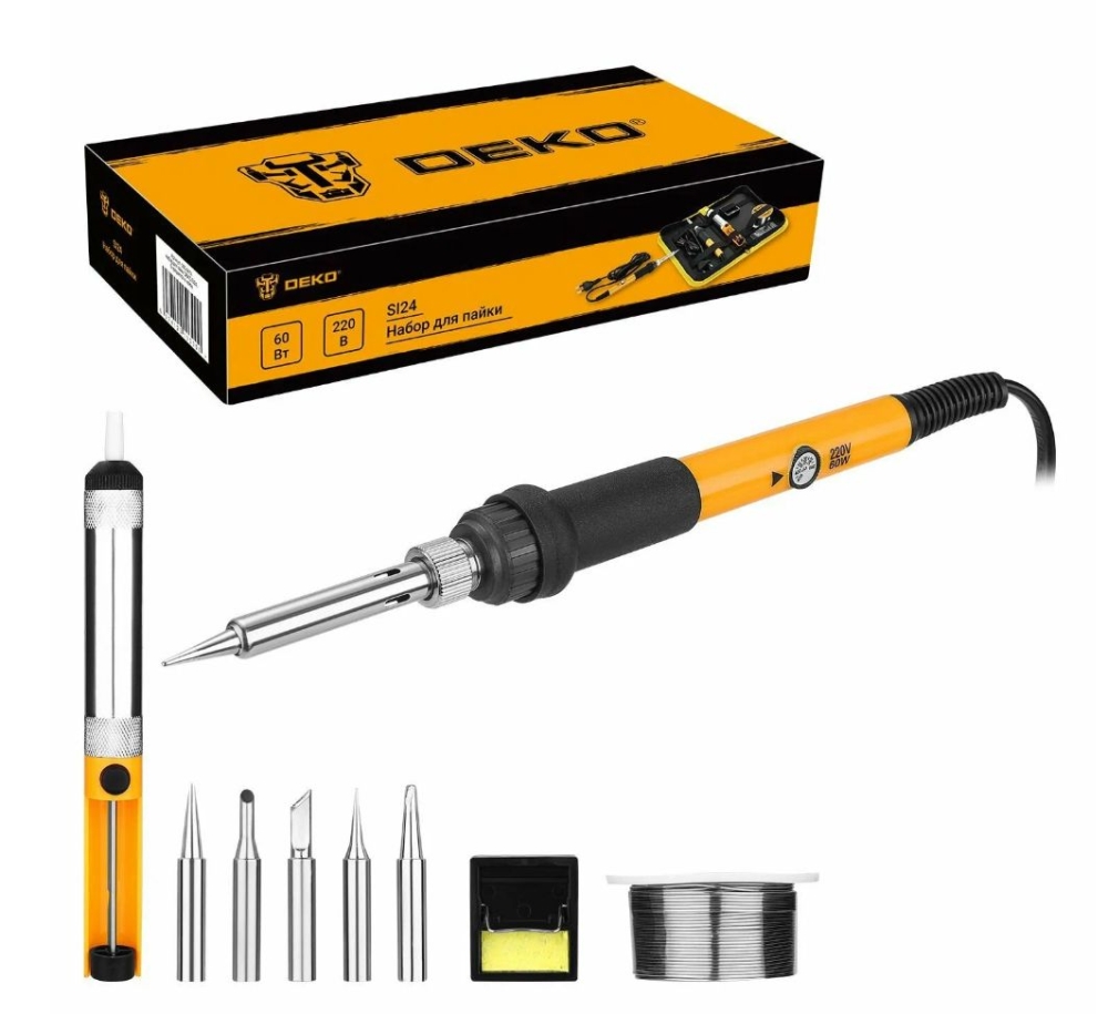 Комплектация: паяльник 60 Вт, 220 В (1 шт.), комплект из 5 типов наконечников (конус, игла, клин, скос и ножевидное), держатель для паяльника (1 шт.), губка для очистки паяльного жала (1 шт.), припой на катушке (1 шт.), оловоотсос для припоя (1 шт.), пенал на молнии (1 шт.).