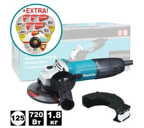 Артикул:GA5030RX8Мощность, Вт:720Питание:сетьДлина сетевого шнура, м:2,5Регулировка оборотов:нетВид двигателя:щеточныйМасса нетто, кг:1,8Комплектация:Боковая рукоятка, защитный кожух, гайка, ключ, диск B-45808 (5 шт), коробкаГарантия:12 месЧастота вращения на холостом ходу, об/мин:11000Диаметр посадочного отверстия, мм:22,2Макс. диаметр диска, мм:125Резьба шпинделя:М14Блокировка шпинделя при заклинивании диска:даПлавный пуск:да