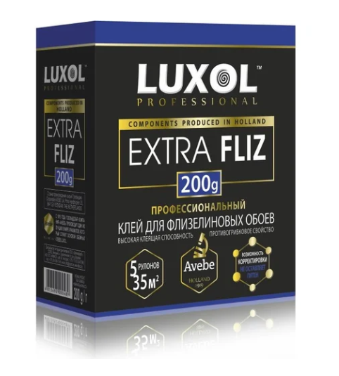 Обойный клей LUXOL EXTRA FLIZ (Professional) 200 г EXTRA FLIZ 200г. - специальный клей для наклеивания обоев на флизелиновой основе путем нанесения клея прямо на стену.