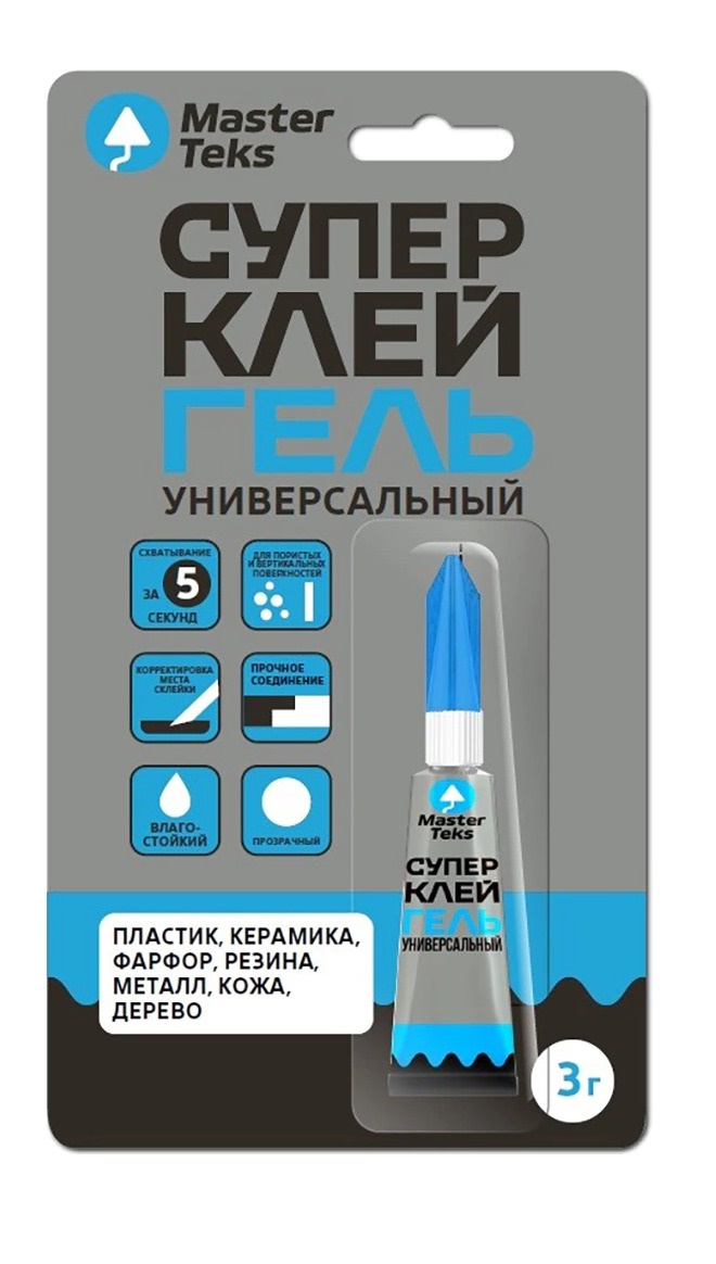 Супер-клей Masterteks — универсальный однокомпонентный цианакрилатный клей предназначен для моментального и надежного склеивания изделий из разнообразных материалов, включая пластик, керамику, фарфор, резину, металл, кожу, дерево и другие.