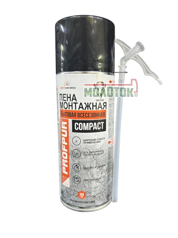 PROFPUR COMPACT — это однокомпонентная полиуретановая монтажная пена бытового назначения с всесезонной формулой.