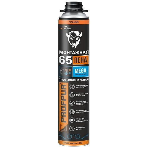 Пена монтажная PROFPUR Mega 870 мл (4814016001717) используется в широком диапазоне температур при установке оконных рам и дверных коробок, изоляции водопровода, обсервации трещин, шумопоглощении и пр.
