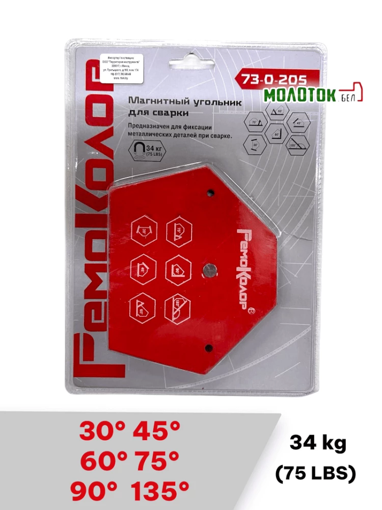 Профессиональный магнитный угольник Remocolor 73-0-205 с силой сцепления 34 кг (75LBS) обеспечивает надёжную фиксацию металлических деталей при сварке под углами 30°, 45°, 60°, 75°, 90° и 135°.