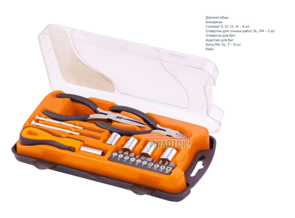 Он будет полезен в хозяйстве для частных мастеров. В наборе есть отвертки для точных работ, отвертка для бит, биты и торцевые головки для монтажа/демонтажа крепежных элементов, бокорезы и длинногубцы для захвата, удержания и перекусывания проводов и мелких деталей.