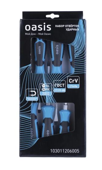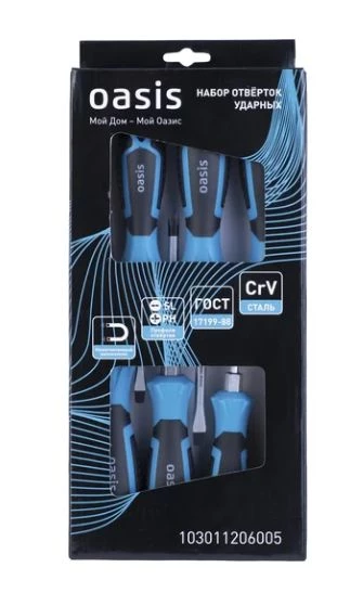 Набор ударных отвёрток Oasis 103011206005 - это набор инструментов, предназначенный для работ, при которых необходимо высокое усилие, например, подтяжки в финале фиксации или откручивания проблемного крепежа.