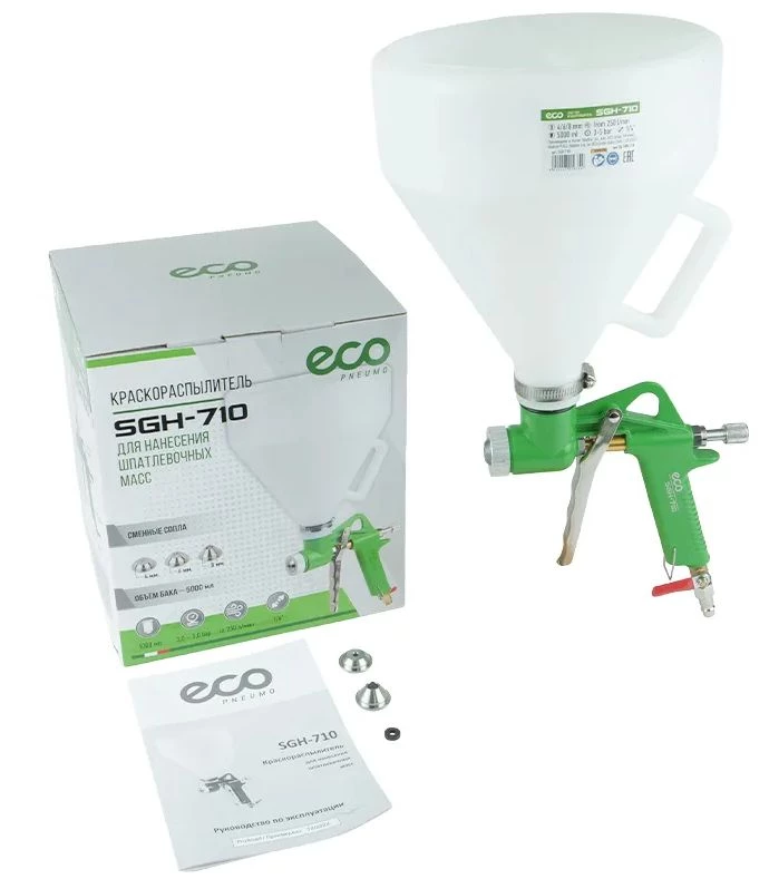 Краскопульт пневматический ECO SGH-710 краскораспылитель предназначен для нанесения декоративной, в том числе мраморной штукатурки, огнезащитной декоративно-гидроизоляционной штукатурки, шпаклевочных масс, фасадных красок и жидких обоев, пробковых покрытий, огнеупорных и защитных материалов, жидких утеплителей, различных материалов, которые используются при текстурной отделке.