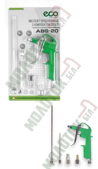 Пистолет продувочный c комплектом сопел ECO ABG-20 Универсальный пистолет для продувки с набором сопел различной длины (короткое 15 мм, среднее 95 мм и длинное 190 мм).