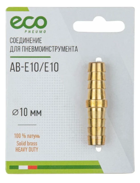 Соединение елочка 10 мм двухсторонняя ECO AB-E10/E10 предназначено для удлинения воздушной магистрали путем соединения 2-х пневмошлангов с внутренним диаметром 10 мм, а также для ремонта разорванных шлангов с аналогичным внутренним диаметром. Латунный корпус исключает возможность появления коррозии.