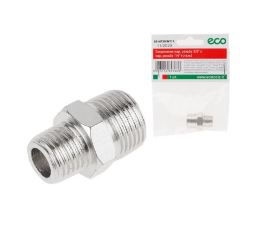 Соединение Eco AS-MT38/MT14 представляет собой высококачественный фитинг из стали, предназначенный для соединения труб с наружной резьбой 3/8" и 1/4".