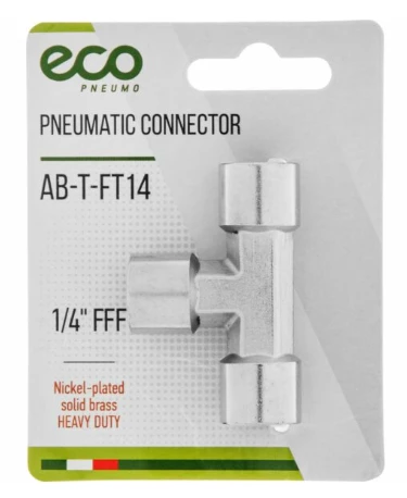 Переходник T-образный внутренняя резьба 1/4″ ECO (AB-T-FT14) из высокопрочной латуни с никелированным покрытием, что повышает устойчивость к коррозии и износу.