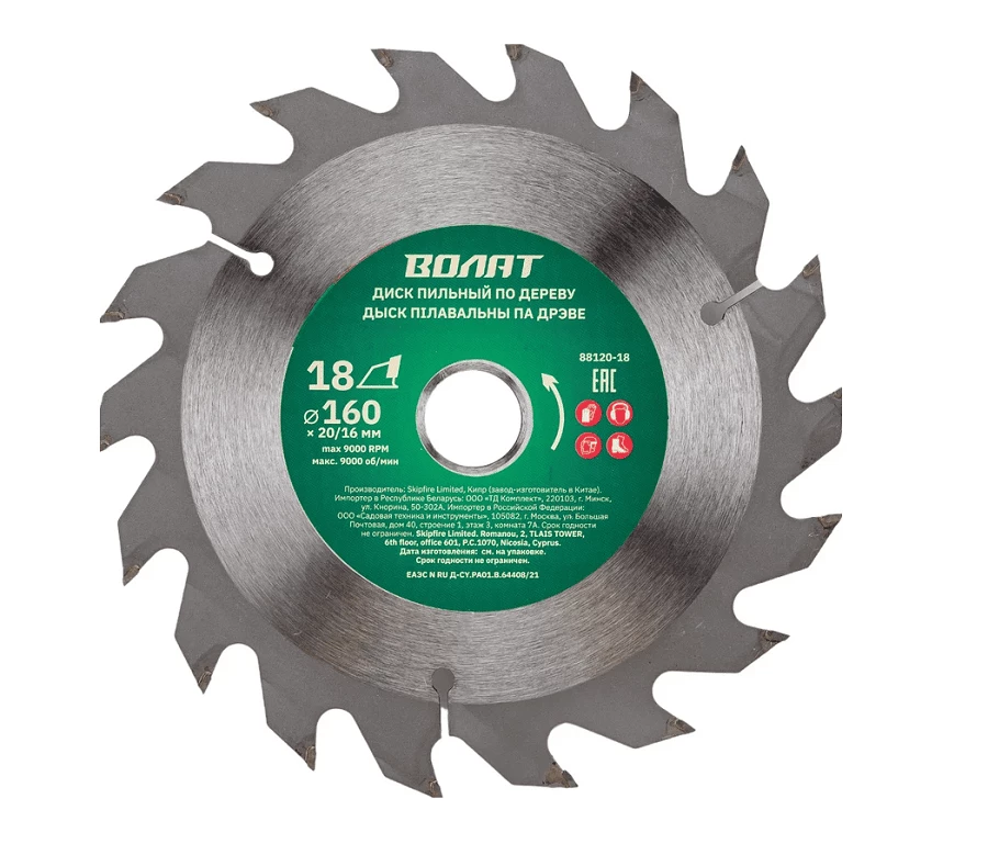 Диск пильный по дереву 160x20/16 мм, 18 зубьев ВОЛАТ 88120-18 предназначен для продольного и поперечного распила древесины. Корпус диска шлифованный, изготовлен из стали 65Г и термонормализован.