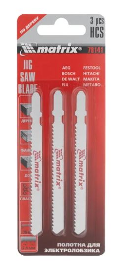 Полотна для электролобзика по дереву Matrix 78141 с рабочей длиной 75 мм и шагом зубьев 2,5 мм, из стали HCS, с EU-хвостовиком, 3 шт. в упаковке, - элементы оснастки электрического пильного инструмента.