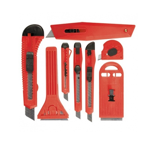 Набор Matrix 78991 состоит из 4 ножей с выдвижными лезвиями шириной 9 мм, 2 ножей с лезвиями 18 мм, а также включает 2 скребка с выдвижным и фиксированным лезвиями шириной 40 и 52 мм соответственно.
