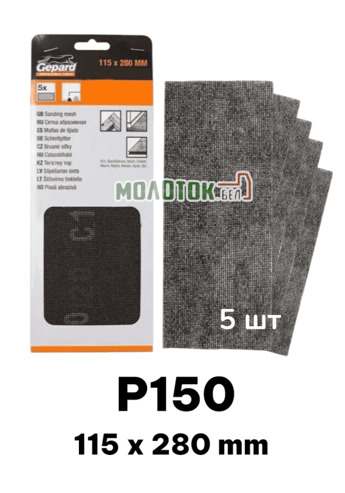 Сетка абразивная 5 шт, 115x280 мм, Р150 GEPARD служит для шлифования металлических поверхностей, гипсокартона и для выравнивания штукатурных поверхностей.