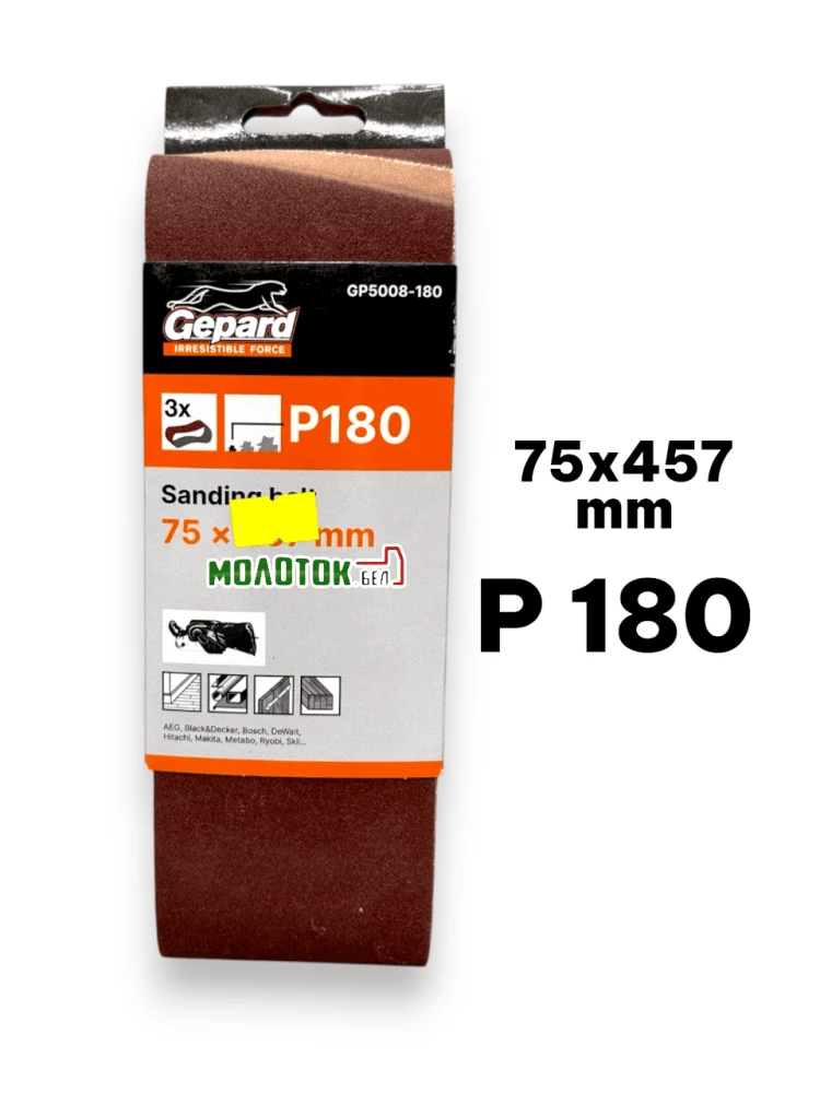 Шлифлента 3 шт, 75x457 мм, Р180 Gepard GP5008-180 используется для ленточных шлифмашин. Предназначена для шлифования металла, дерева, пластика и других материалов.