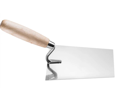 Рабочая поверхность кельмы выполнена из нержавеющей стали, ручка из дерева.