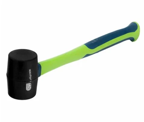 Резиновая киянка Сибртех из черной резины, с фибергласовой рукояткой и бойком весом 450 г, применяется при проведении монтажных, сборочных и кузовных работ, для укладки плитки.