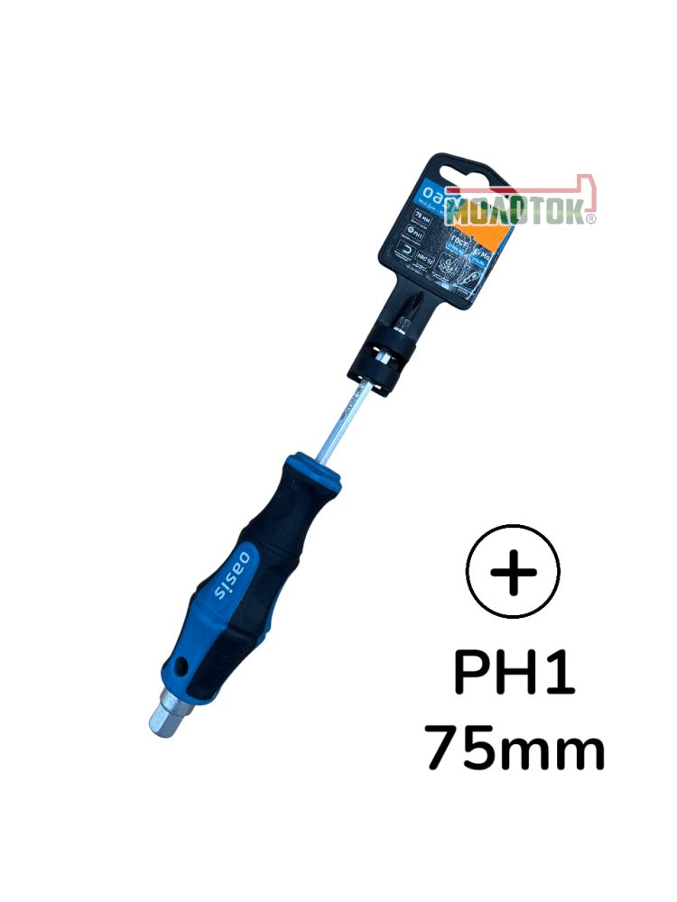 Ударная отвёртка Oasis PH1×75 мм (CR-MO) — профессиональный инструмент для монтажа и демонтажа крепёжных элементов, в том числе заржавевших или сильно затянутых резьбовых соединений.
