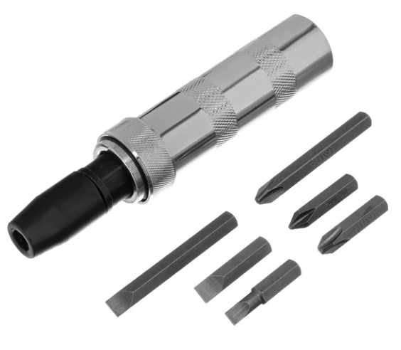 Ударно-поворотная отвертка Matrix 11575 с присоединительным шестигранником 1/2"", с набором из 6 бит, в пластиковом боксе, используется для закручивания и откручивания крепежей, в том числе для демонтажа перетянутых или застарелых резьбовых соединений.