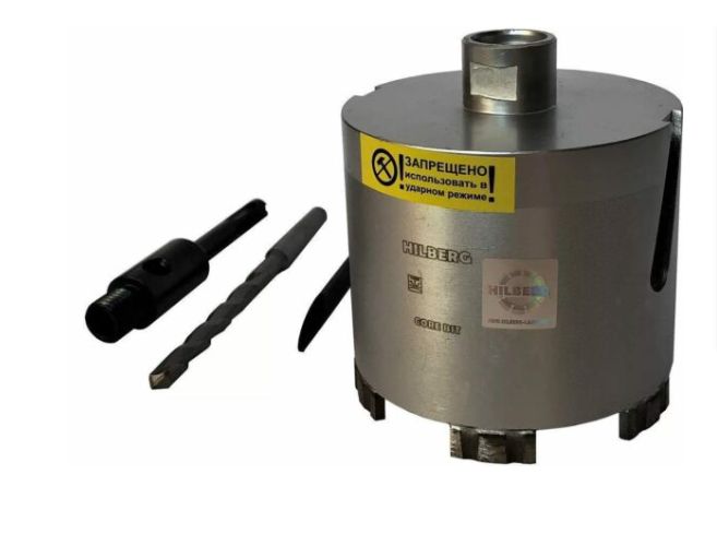Комплект состоит из коронки, центрирующего сверла и переходника SDS-Plus под патрон перфоратора.