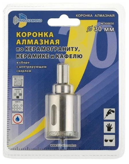 Коронка алмазная d 30 мм по керамике и кафелю TRIO-DIAMOND (400030) предназначена для сверления керамогранита, керамики и подобных материалов.