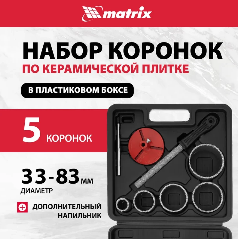Набор коронок Matrix 72842, 33-53-67-73-83 мм, с 6-гранным хвостовиком, напильником, в пластиковом боксе, предназначен для сверления керамической плитки, кирпича, ячеистого бетона и пенобетона, газосиликата, гипсокартона.