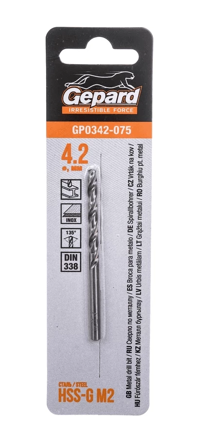 Сверло по металлу GEPARD 4,2×43×75 мм, HSS-G, цилиндрический хвостовик — высокоточное сверло из быстрорежущей стали с легированием (HSS-G), предназначенное для чистого и эффективного сверления отверстий в чёрных и цветных металлах.