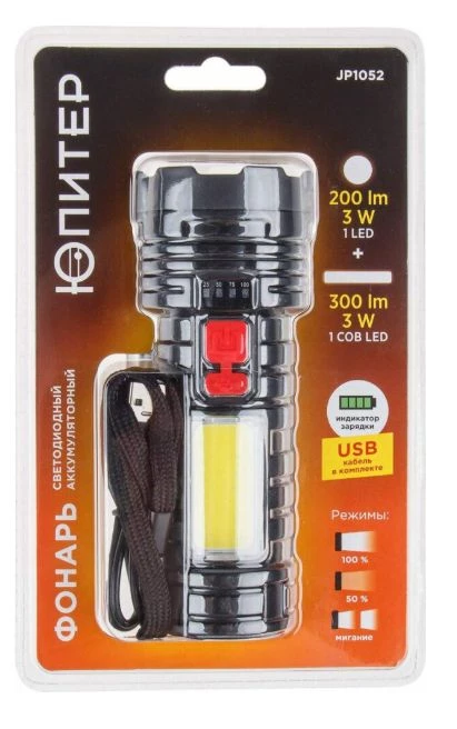 Фонарь ручной светодиодный аккумуляторный 3 Вт+3 Вт ЮПИТЕР (JP1052) с эргономичным корпусом будет удобен при походах, ночных прогулках или других ситуациях.