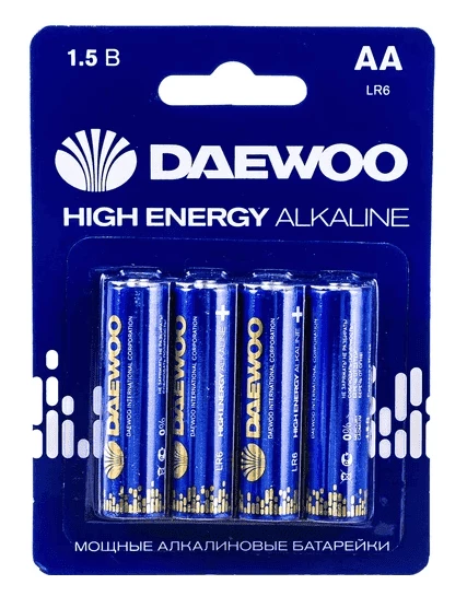 Батарейка DAEWOO High Energy AA 1,5 V алкалиновая 4 штуки (5030329) подходит для часто используемых устройств: фонарики, портативные консоли, механизированные игрушки, пульты ДУ.