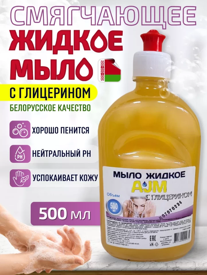 Мыло жидкое AJM с глицерином 500мл используется для мытья рук и тела. Обильно пенится, имеет легкий приятный аромат, активно увлажняет кожу.