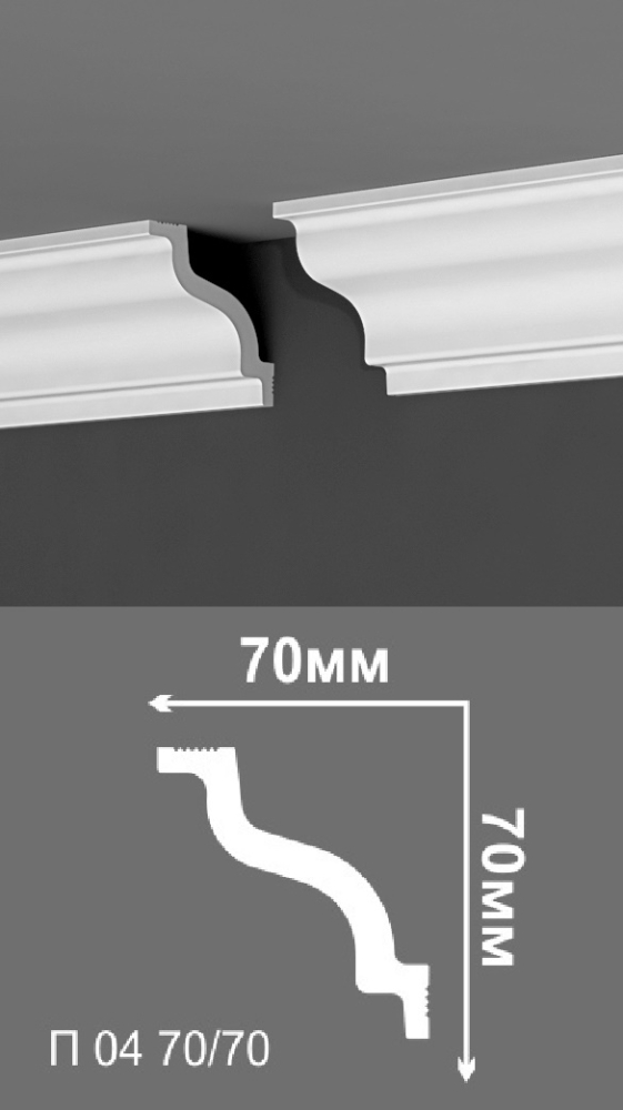 Потолочный плинтус «Де-Багет П 04 70/70» — декоративный элемент для внутренней отделки помещений, предназначенный для маскировки стыка между стеной и потолком.