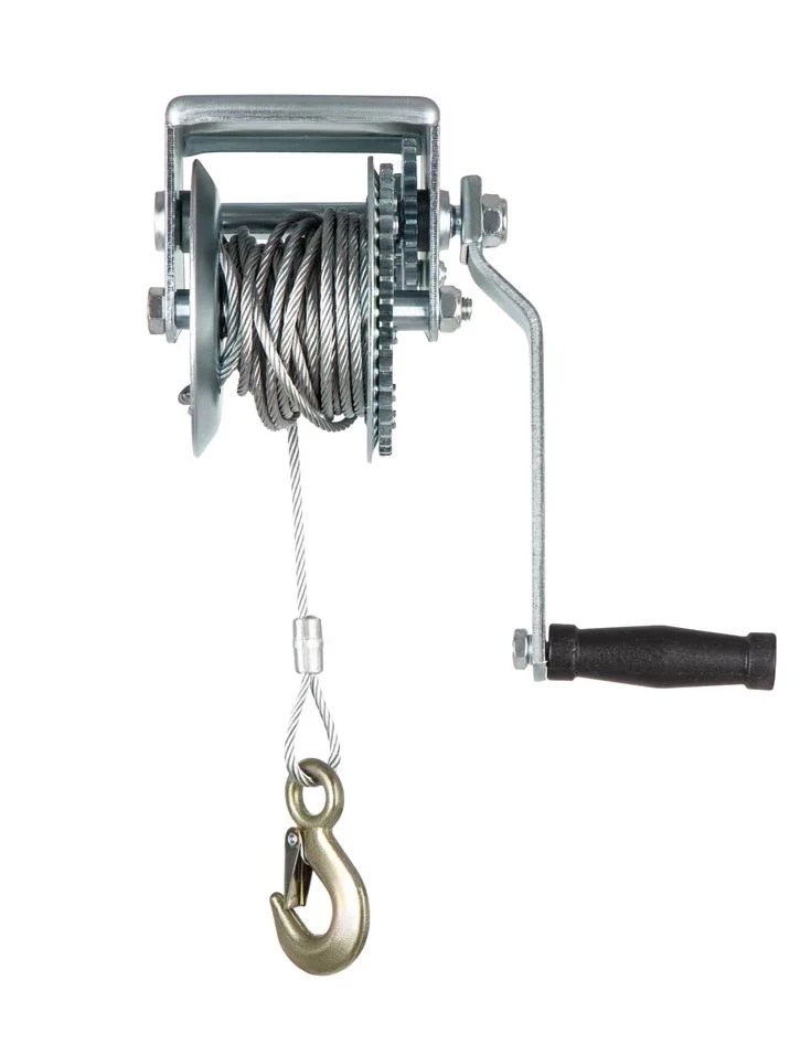 Шестеренчатая лебедка имеет прочный стальной корпус и стальной шестеренчатый механизм, который приводится в движение вращением ручки.
