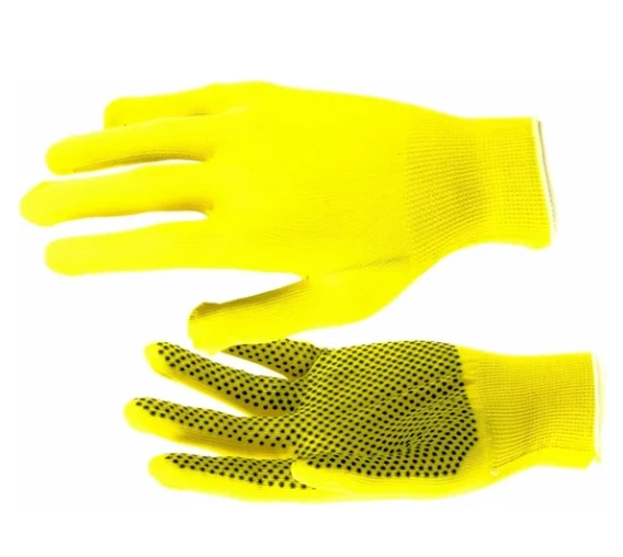 Перчатки из синтетической нити 67827 с ПВХ точкой, цвета «лимон», 13 класс вязки, размера L, применяются для защиты рук от царапин и ссадин.