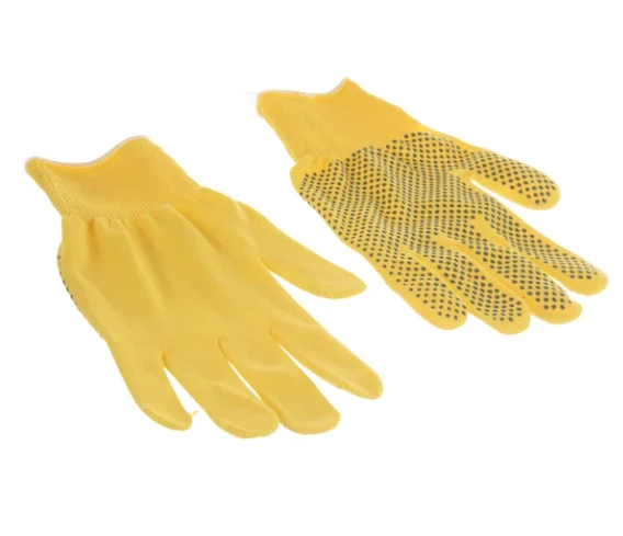 Перчатки из синтетической нити 67827 с ПВХ точкой, цвета «лимон», 13 класс вязки, размера L, применяются для защиты рук от царапин и ссадин.