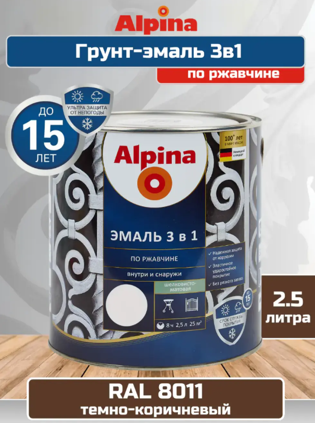 Alpina Эмаль по ржавчине 3 в 1 - Специальная алкидно-уретановая эмаль для антикоррозионной защиты поверхностей из черных металлов, а также с возможностью нанесения на оцинкованную поверхность.