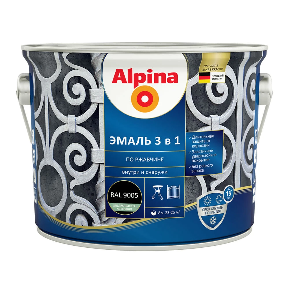 Эмаль алкидно-уретановая ALPINA По ржавчине 3 в 1 RAL 9005 чёрный 2,5 л - антикоррозионная эмаль для поверхностей из черных металлов с возможностью нанесения на оцинкованную поверхность.