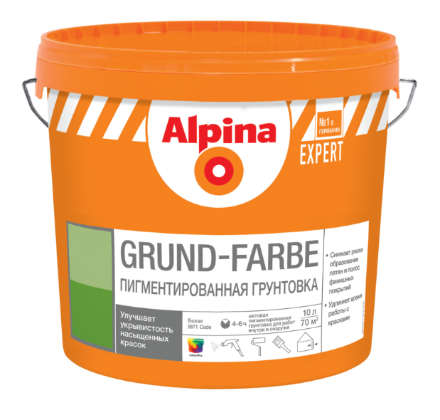 Грунтовка Alpina EXPERT Grund-Farbe улучшает укрывистость насыщенных и темных красок.