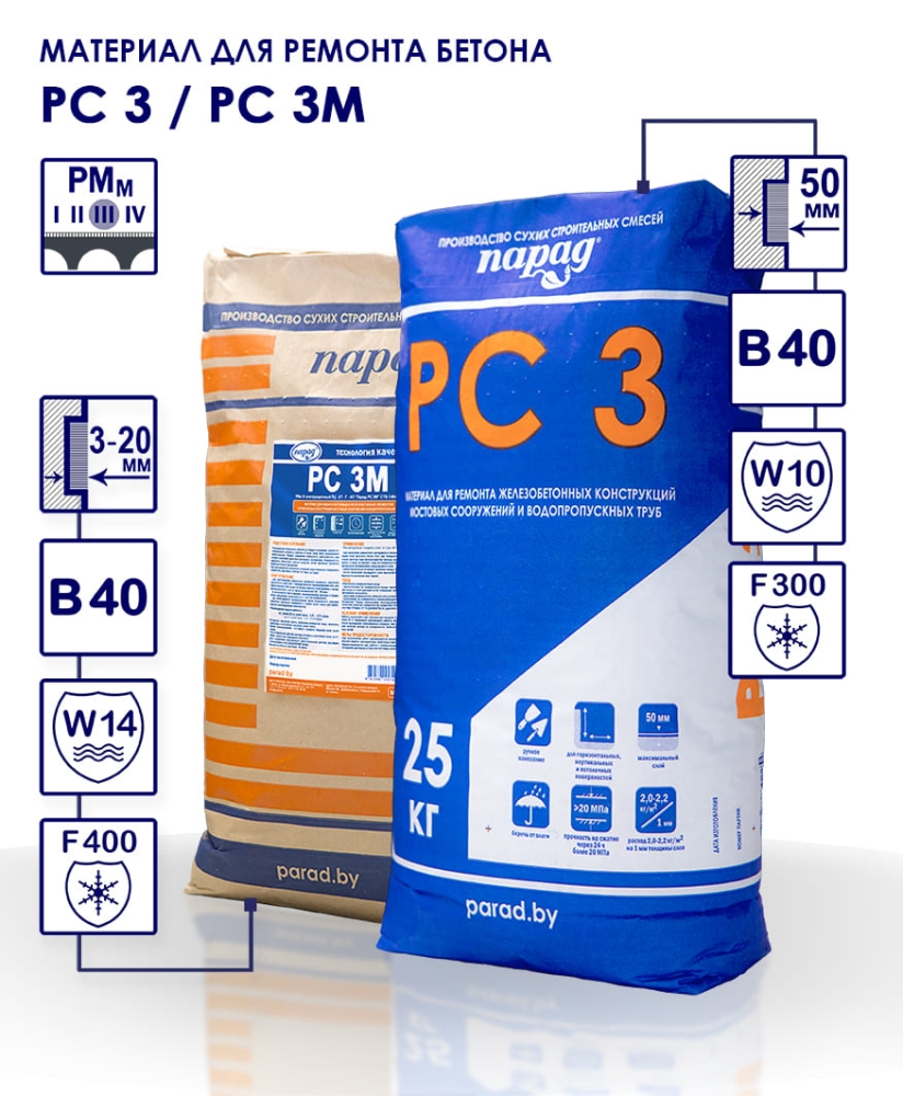 РС 3 – безусадочная мелкозернистая ремонтная смесь мостового типа РМм III для конструкционного ремонта бетона.