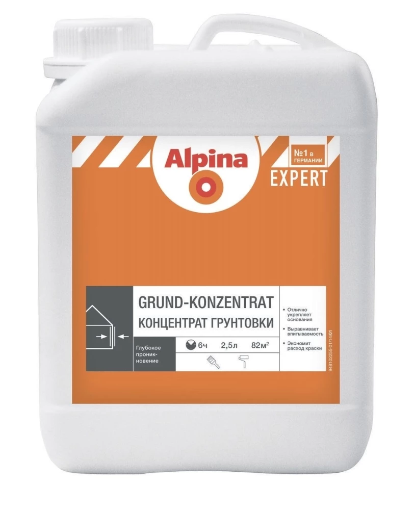 Универсальный грунт-концентрат ALPINA EXPERT Grund-Konzentrat (глубокого проникновения; 2,5 л) отличается высокой проникающей способностью, укрепляет основание и снижает впитывающую способность минеральных поверхностей,