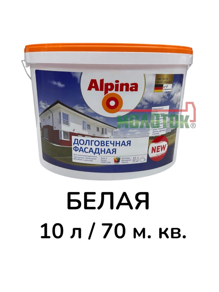 Краска Alpina Долговечная фасадная — это высококачественное водно-дисперсионное покрытие на акриловой основе, разработанное для эффективной защиты фасадов зданий от атмосферных воздействий.
