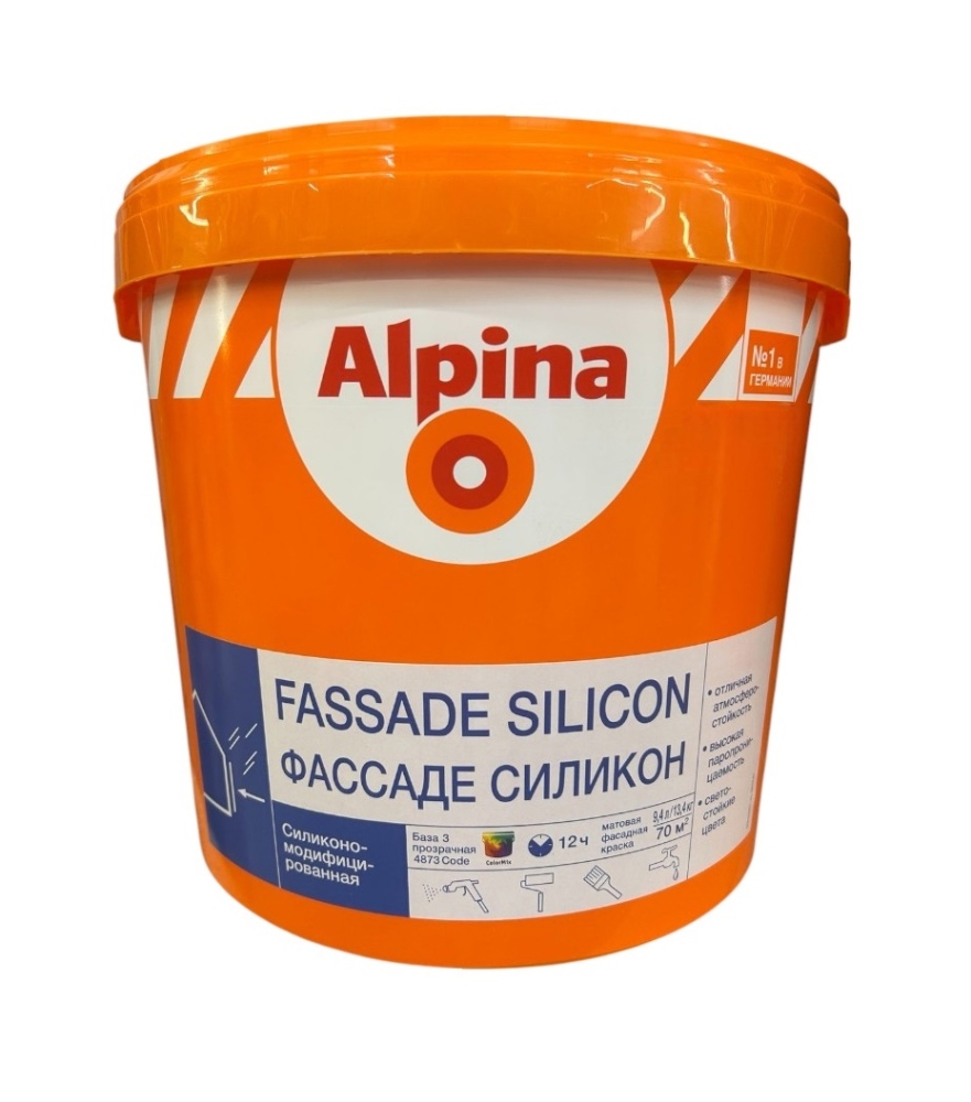 Краска латексная ALPINA Expert Fassade Silicon прозрачная 9,4 л/13,4 кг силикономодифицированная дисперсионная краска с огромным выбором оттенков для матовых, стойких к атмосферным воздействиям, паропроницаемых покрытий.