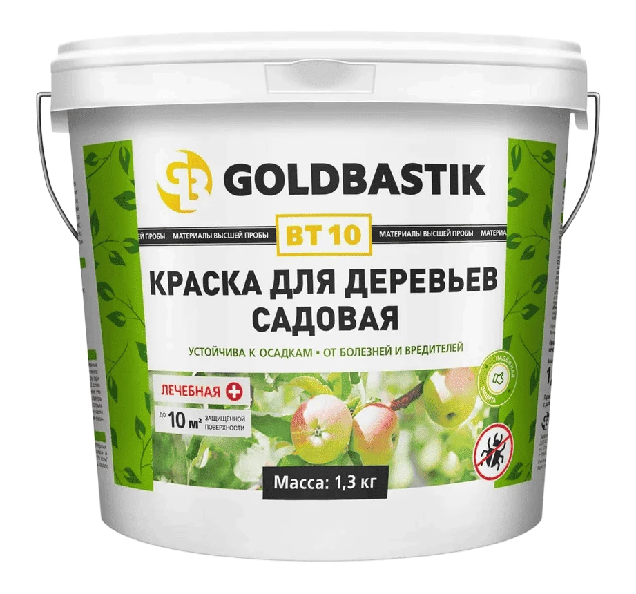 Краска для деревьев садовая GOLDBASTIK BТ 10 — биотехническое средство для замазывания распилов, а также для лечебно-профилактической окраски и дезинфекции стволов и ветвей садовых деревьев и кустарников, как плодовых, так и декоративных.