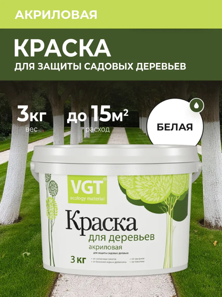 Краска ВГТ для деревьев — это краска акриловая. Предназначена для защиты садовых, декоративных деревьев и