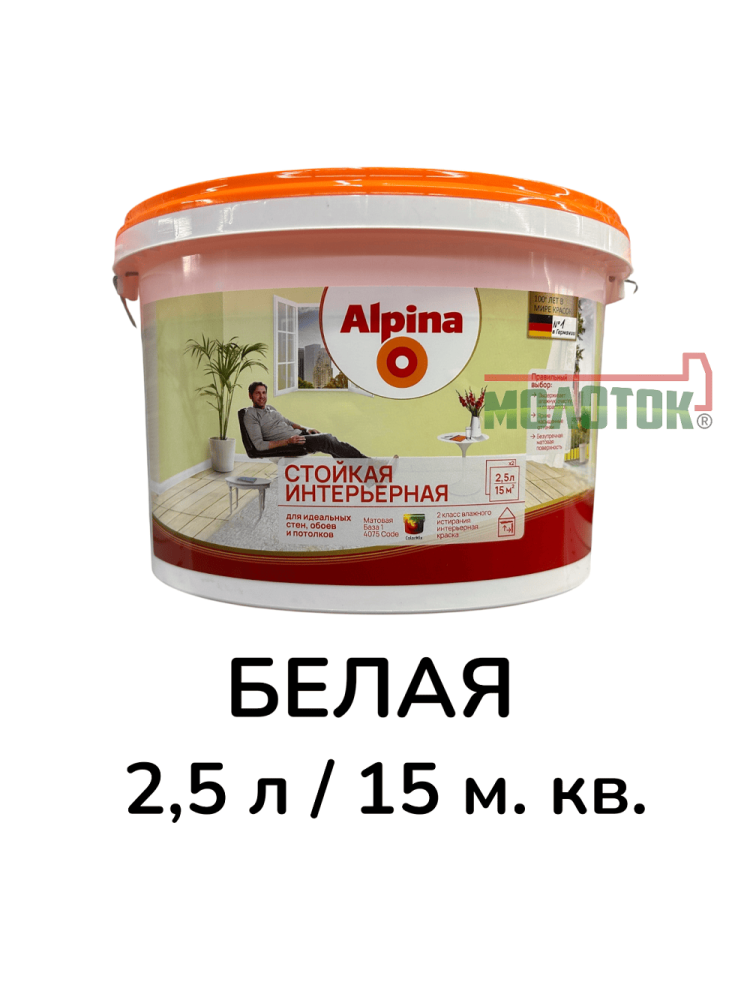 Краска Alpina ВД-ВАЭ — стойкая интерьерная краска (База 1) для помещений с нормальной влажностью, которая отлично подходит для создания долговечного матового покрытия.