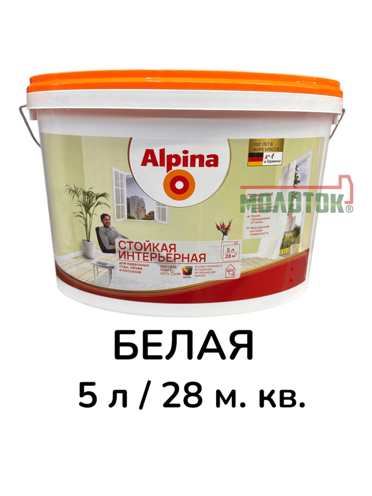 Краска Alpina ВД-ВАЭ — стойкая интерьерная краска (База 1) для помещений с нормальной влажностью, которая отлично подходит для создания долговечного матового покрытия.